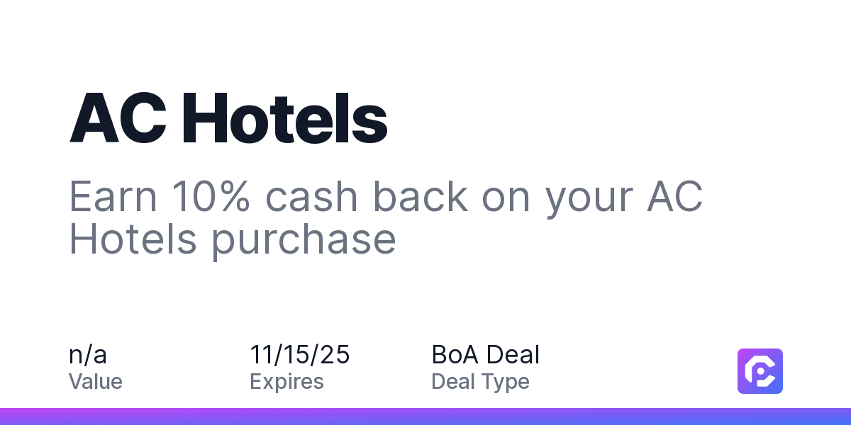 Earn 10% cash back on your AC Hotels stay, with a $57.00 cash back maximum, when you spend $100 or more.What if there was a hotel that knew exactly what you needed? At AC Hotels, we obsess over the details and experiences that really matter. Open spaces. Purposeful design. European-inspired food and beverage.Book NowOffer expires 11/15/2025. Offer valid in-store in the US only and online at US website ac-hotels.marriott.com only. Complete payment for your stay must be made by 11/15/2025. Payment must be made directly with the merchant. Offer not valid on purchases made using third-party services. Payment must be made on or before offer expiration date. Offer valid one time only. Offer not valid at Autograph Collection Hotels properties. Offer not valid at other Marriott properties.Payment must be made directly with merchantCash back may not be processed until your travel or stay is completed.If a merchant process your payment in separate transactions, you may only earn cash back on the value of the first transaction.