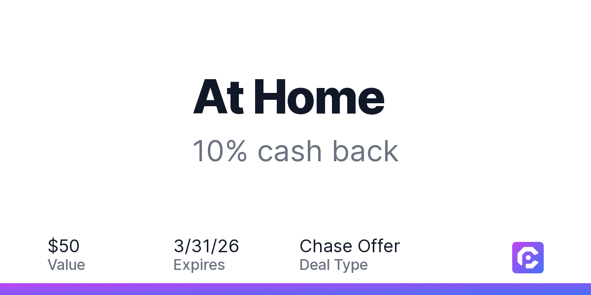 Earn 10% cash back on your At Home purchase, including taxes and after any discounts, with a $50 cash back maximum.Discover At Home, your go-to design and decorating source. Get inspired to transform your space into a true reflection of who you are, how you want to live, and the memories you aim to create at home. Explore curated collections, seasonal selections & unique pieces that show off your signature style. Design your life, At Home.Offer expires 3/31/2026. Offer valid one time only. Offer only valid on purchase made directly with the merchant. Offer valid in-store or online. Offer not valid on purchase made using third-party services, delivery services, or a third-party payment account (e.g., buy now pay later). Offer only valid on U.S. purchase. It is possible that the merchant may split your purchase into multiple transactions. Offer redemption awarded as statement credit on the first qualifying transaction amount. Payment must be made on or before 3/31/2026.