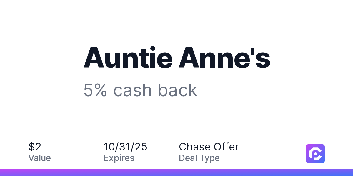 Offer expires 10/31/2025. Offer valid in-restaurant and for food purchases made online at US website auntieannes.com and through the merchant mobile app. Dining or takeout/delivery orders must be processed directly by the merchant. Valid in the US only. Payment must be made directly with the merchant. Offer not valid on purchases made using third-party services, delivery services, or a third-party payment account (e.g., buy now pay later). Payment must be made on or before offer expiration date. Offer valid one time only.