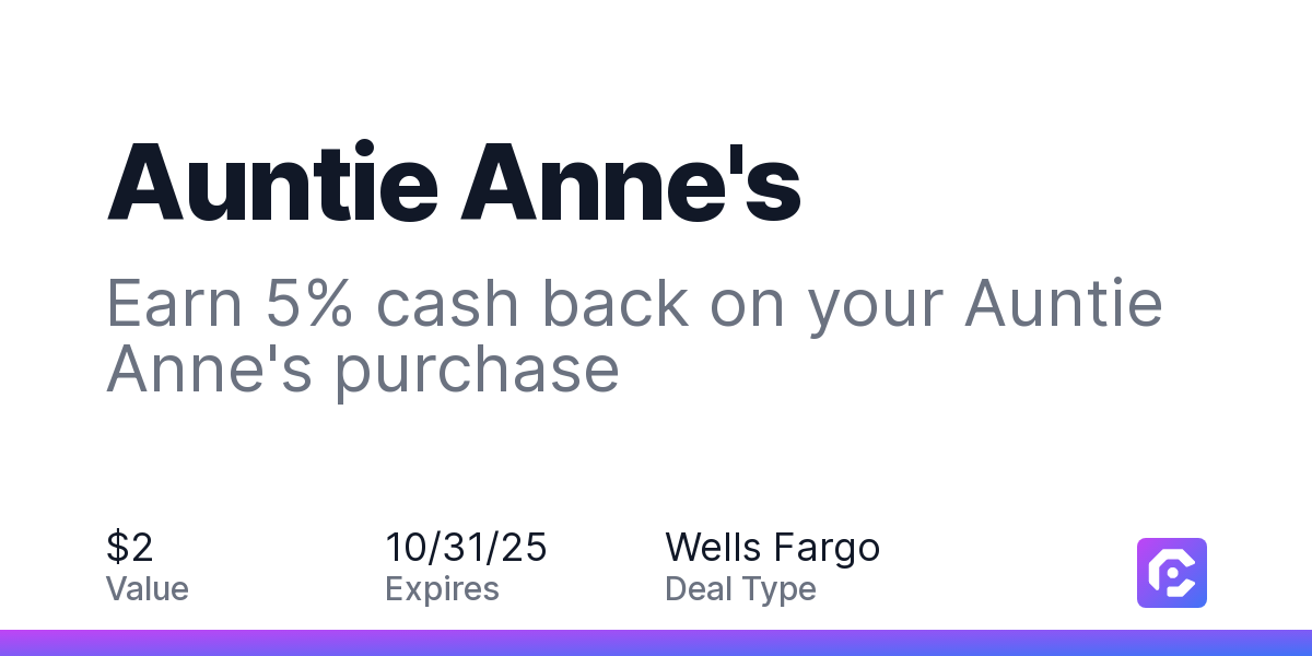 Earn 5% cash back on your Auntie Anne's purchase, with a $2.00 cash back maximum. Get Twisted with any of Auntie Anne’s hot and handmade pretzels. There are plenty of pretzels to choose from; the salty Original Pretzel, sweet Cinnamon Sugar nuggets, or savory Mini Pretzel Dogs. Upgrade your order with a delicious dip and refreshing drink for the perfect twist. Order Now Offer expires 10/31/2025. Offer valid in-restaurant and for food purchases made online at US website auntieannes.com and through the merchant mobile app. Dining or takeout/delivery orders must be processed directly by the merchant. Valid in the US only. Payment must be made directly with the merchant. Offer not valid on purchases made using third-party services, delivery services, or a third-party payment account (e.g., buy now pay later). Payment must be made on or before offer expiration date. Offer valid one time only.