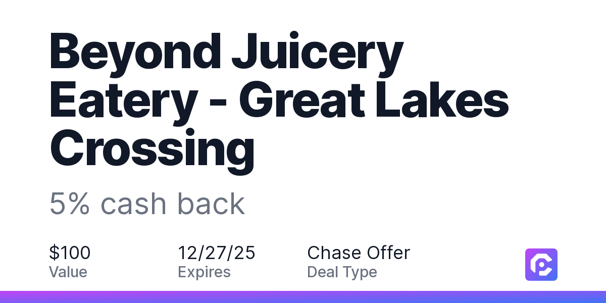 Earn 5% cash back on all of your Beyond Juicery Eatery - Great Lakes Crossing purchases, until a $100.00 cash back maximum is reached.