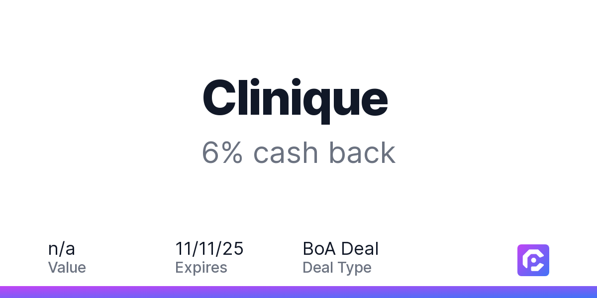 Shop now to earn cash back on your online purchases at Clinique. In order to earn cash back, you must use the link below to initiate your shopping trip at the Clinique website. Add an eligible item or items to your cart and check out as you normally would. Cash back awards are calculated only on eligible items purchased, and exclude the taxes and shipping on the total order. Please note returning part or all of your order will affect your cash back reward. In most cases, your Clinique cash back will be a single cash back transaction from the merchant on the Earned tab within 30 days of transaction posting date.SHOP NOWMerchant specific terms and conditions may apply. See merchant interstitial and transition page for details and exclusions.Payment must be made directly with the merchant.Purchases made using digital wallets, order-ahead apps or delivery services may not qualify where the identity of the merchant is not passed to us as part of the transaction.Please review all of the above terms for eligible locations, time and date restrictions.
