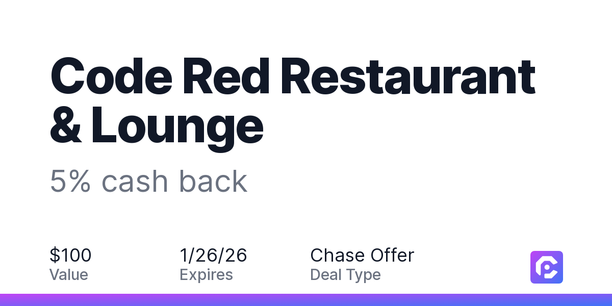 Earn 5% cash back on all of your Code Red Restaurant & Lounge purchases, until a $100.00 cash back maximum is reached.
