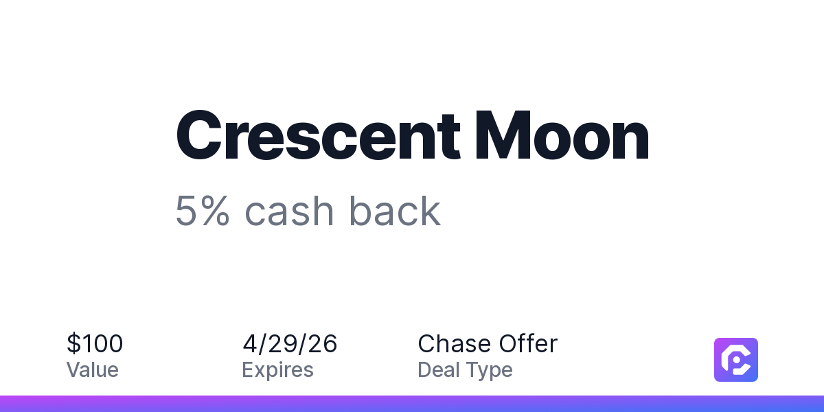 Earn 5% cash back on all of your Crescent Moon purchases, until a $100.00 cash back maximum is reached.