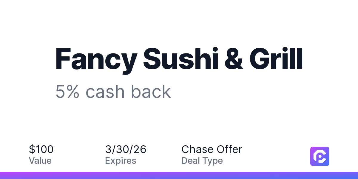 Earn 5% cash back on all of your Fancy Sushi & Grill purchases, until a $100.00 cash back maximum is reached.