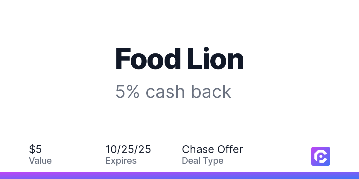 Offer expires 10/25/2025. Offer valid in-store in the US and online at US website foodlion.com only. Not valid on purchases made through a department other than the primary grocery business (e.g., for pharmacy, gas, tobacco, alcohol or lottery purchases). Payment must be made directly with the merchant. Offer not valid on purchases made using third-party services, delivery services, or a third-party payment account (e.g., buy now pay later). Payment must be made on or before offer expiration date. Offer valid one time only.
