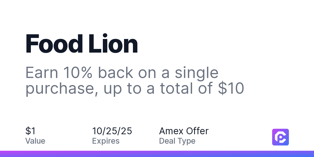 Earn 10% back as a one-time statement credit after using your enrolled eligible Card to make a single purchase in-store at Food Lion or online at foodlion.com by 10/25/2025. Limit of 1 statement credit, up to a total of $10. See terms.