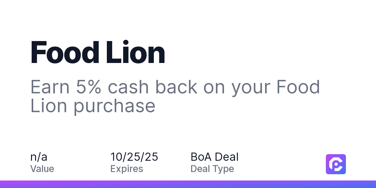 Earn 5% cash back on your Food Lion purchase, with a $5.00 cash back maximum.At Food Lion, fresh food & quality service are a guarantee. Our fresh food is backed by a double your money back guarantee. Browse our fully stocked aisles for everything you & your family need at prices you'll love. Try Food Lion To Go to order fresh food online and pick up at one of our stores or have your groceries delivered to your home.Shop NowOffer expires 10/25/2025. Offer valid in-store in the US and online at US website foodlion.com only. Not valid on purchases made through a department other than the primary grocery business (e.g., for pharmacy, gas, tobacco, alcohol or lottery purchases). Payment must be made directly with the merchant. Offer not valid on purchases made using third-party services, delivery services, or a third-party payment account (e.g., buy now pay later). Payment must be made on or before offer expiration date. Offer valid one time only.Payment must be made directly with the merchant.Purchases made using digital wallets, order-ahead apps or delivery services may not qualify where the identity of the merchant is not passed to us as part of the transaction.Please review all of the above terms for eligible locations, time and date restrictions.