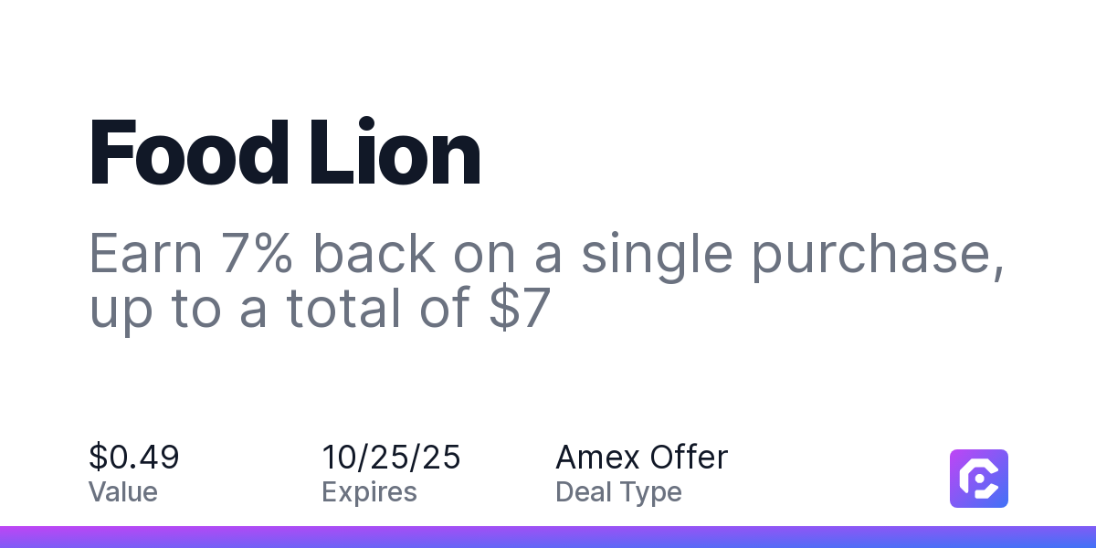 Eligibility and EnrollmentEnrollment is limited. Eligible Card Members must first add offer to Card and then use same Card for qualifying spend. Only US-issued American Express® Cards are eligible.Limit of 1 statement credit per eligible Card Member account. If the Card Account is canceled or past due, it may not qualify to receive the statement credit(s).Qualifying PurchasesOffer valid in-store at participating locations in the US and online at US website foodlion.com only. Not valid on purchases made through a department other than the primary grocery business (e.g., for pharmacy, gas, tobacco, alcohol or lottery purchases). Offer valid only on purchases made in US dollars.Offer only valid on purchases made directly with the merchant. Offer not valid on purchases made using third parties, such as resellers, delivery services, or other intermediaries.Statement CreditPlease allow 90-days after 10/25/2025 for the statement credit(s) to be posted to the Account, provided that American Express receives information from the merchant about your qualifying purchase. Participation in Amex Offers is subject to Amex Offers Program Terms.POID: K7Z3:0094