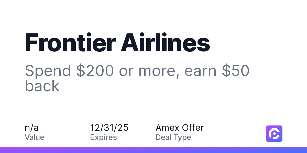 Eligibility and EnrollmentEnrollment is limited. Eligible Card Members must first add offer to Card and then use same Card for qualifying spend. Only US-issued American Express® Cards are eligible.Limit of 1 statement credit per eligible Card Member account. If the Card Account is canceled or past due, it may not qualify to receive the statement credit(s).Qualifying PurchasesOffer valid for purchases made directly with Frontier Airlines online at US website flyfrontier.com, or through the Frontier Airlines app. Flights must originate in the US. In-flight purchases, baggage, pets, cancellation and change fees, and Business and group travel are included. Excludes (i) travel insurance, car rentals, hotels, airport transfers, tours, activities, and (ii) gift vouchers. Offer valid only on purchases made in US dollars.Offer only valid on purchases made directly with the merchant. Offer not valid on purchases made using third parties, such as resellers, delivery services, or other intermediaries.Statement CreditPlease allow 90-days after 12/31/2025 for the statement credit(s) to be posted to the Account, provided that American Express receives information from the merchant about your qualifying purchase.Participation in Amex Offers is subject to Amex Offers Program Terms.POID: KAXC:0001