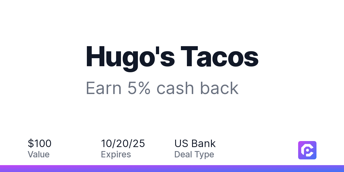 Earn 5% cash back on all of your Hugo's Tacos purchases, until a $100 cash back maximum is reached.