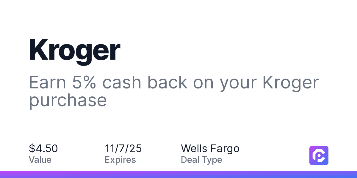 Earn 5% cash back on your Kroger purchase, with a $4.50 cash back maximum. At Kroger you never compromise. You always get up high quality and down low prices. High quality like fresh items that are guaranteed or your money back. And down low prices in every aisle. With quality and easy savings, Kroger shoppers never compromise. Shop Now Offer expires 11/7/2025. Offer valid in-store in the US and online at US website kroger.com only. Not valid on purchases made through a department other than the primary grocery business (e.g., for pharmacy, gas, tobacco, alcohol or lottery purchases). Payment must be made directly with the merchant. Offer not valid on purchases made using third-party services, delivery services, or a third-party payment account (e.g., buy now pay later). Payment must be made on or before offer expiration date. Offer valid one time only.