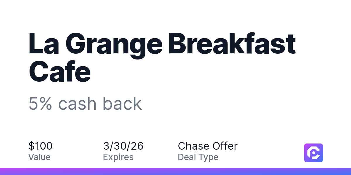 Earn 5% cash back on all of your La Grange Breakfast Cafe purchases, until a $100.00 cash back maximum is reached.