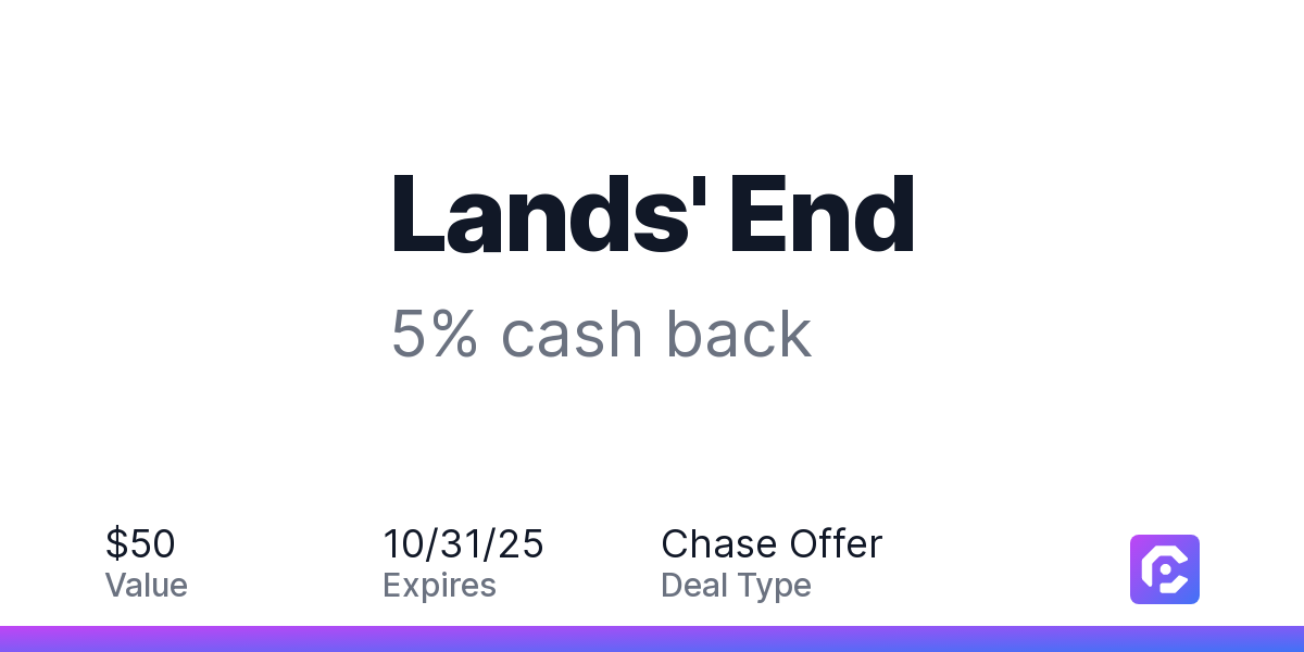 Earn 5% cash back on your Lands' End purchase, including taxes and after any discounts, with a $50 cash back maximum.Lands' End® is a classic American lifestyle brand with a passion for quality, legendary service, real value and a simple two-word promise to stand behind everything it sells: Guaranteed. Period. As a global multi-channel retailer, Lands’ End offers classically styled apparel, swimwear, and outerwear for Women, Men, and Kids, plus a complete line of home products, luggage, and seasonal gifts.We provide our customers with the highest level of service in our industry, unparalleled quality and value, and an unequivocal ironclad guarantee. Consistently, Lands’ End ranks in the top 10 for best customer service by the NRF (National Retail Federation).Offer expires 10/31/2025. Offer valid one time only. Offer only valid on purchase made directly with the merchant. Offer valid in-store or online. Offer not valid on purchase made using third-party services, delivery services, or a third-party payment account (e.g., buy now pay later). Offer only valid on U.S. purchase. It is possible that the merchant may split your purchase into multiple transactions. Offer redemption awarded as statement credit on the first qualifying transaction amount. Payment must be made on or before 10/31/2025.