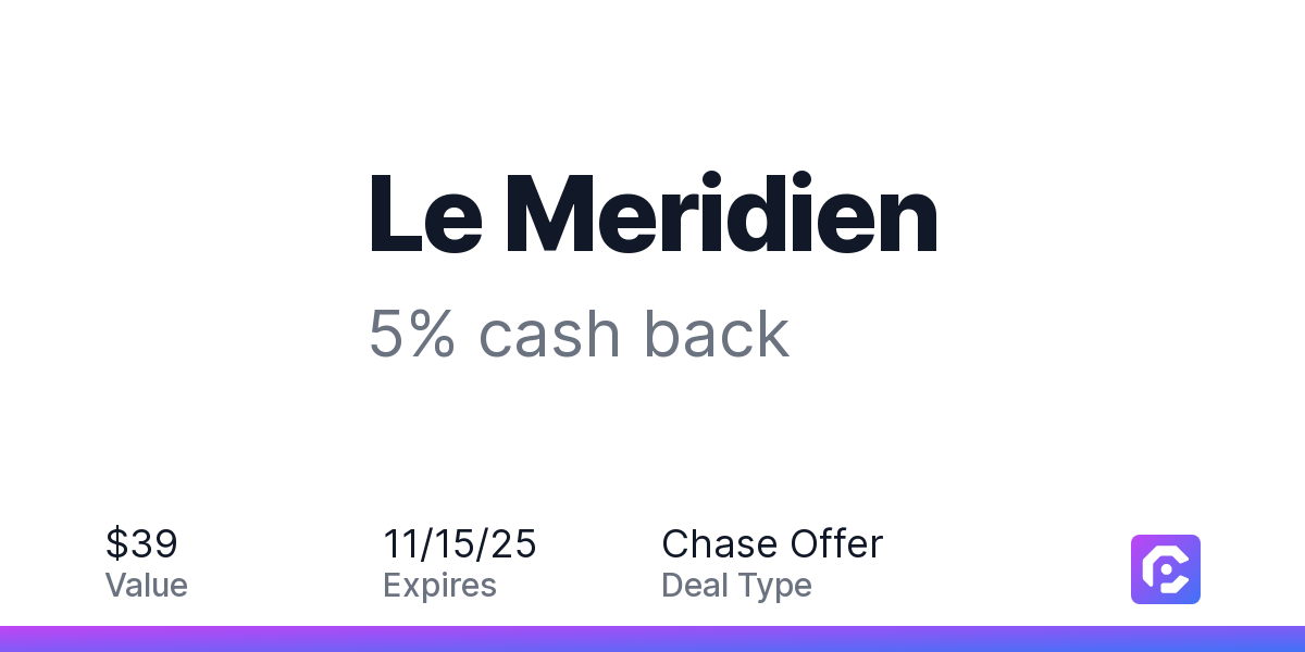 Earn 5% cash back on your Le Meridien stay, with a $39.00 cash back maximum, when you spend $100 or more.