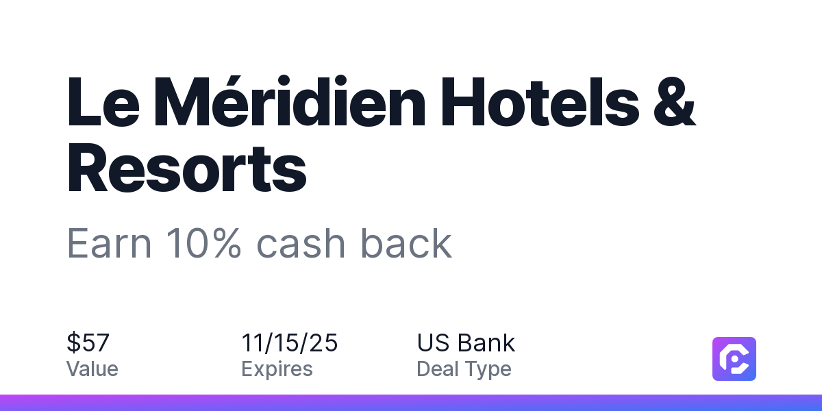 Earn 10% cash back on your Le Méridien Hotels & Resorts stay, with a $57 cash back maximum, when you spend $100 or more.