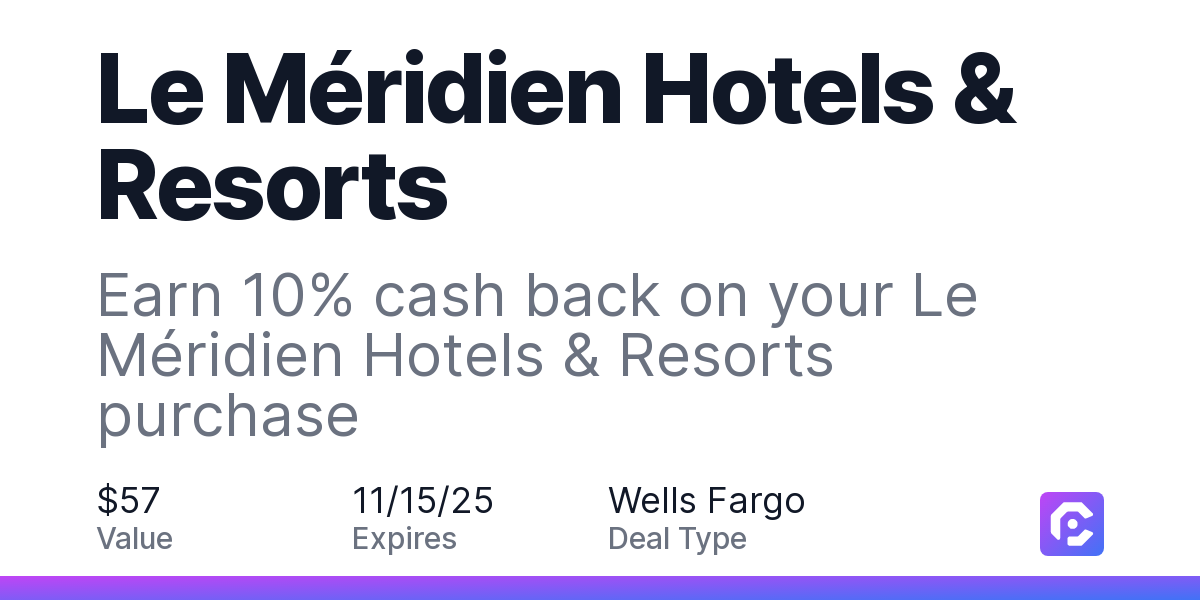 Earn 10% cash back on your Le Méridien Hotels & Resorts stay, with a $57.00 cash back maximum, when you spend $100 or more. Savour the good life with Le Méridien Hotels & Resorts. Travel the world in style, enjoy the moment and savour the journey at over 110 hotels and resort destinations worldwide. Go there with Marriott Bonvoy. Book Now Offer expires 11/15/2025. Offer valid in-store in the US only and online at US website le-meridien.marriott.com only. Complete payment for your stay must be made by 11/15/2025. Payment must be made directly with the merchant. Offer not valid on purchases made using third-party services. Payment must be made on or before offer expiration date. Offer valid one time only. Offer only valid at Le Méridien Hotels & Resorts. Offer not valid at other Marriott properties.