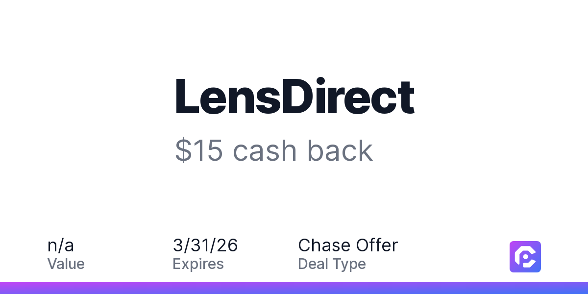 Earn $15 cash back on your LensDirect purchase when you spend $130 or more, including taxes and after any discounts.See clearly with LensDirect.com - your premier destination for vision care! As your ultimate one-stop shop for everything optical, we offer contact lenses, glasses, sunglasses, and our award-winning lens replacement service (your frames, new lenses) - all at unbeatable prices with exceptional service. Now featuring Ray-Ban!Skip the hassle of store visits and shop worry-free with our unbeatable return policy and commitment to personalized care. Experience convenience, savings, and outstanding service with LensDirect.com!Offer expires 3/31/2026. Offer valid one time only. Offer only valid on purchase made directly with the merchant. Offer valid online only. Offer not valid on purchase made using third-party services, delivery services, or a third-party payment account (e.g., buy now pay later). Offer only valid on U.S. purchase. It is possible that the merchant may split your purchase into multiple transactions. Offer redemption awarded as statement credit on the first qualifying transaction amount. Payment must be made on or before 3/31/2026.