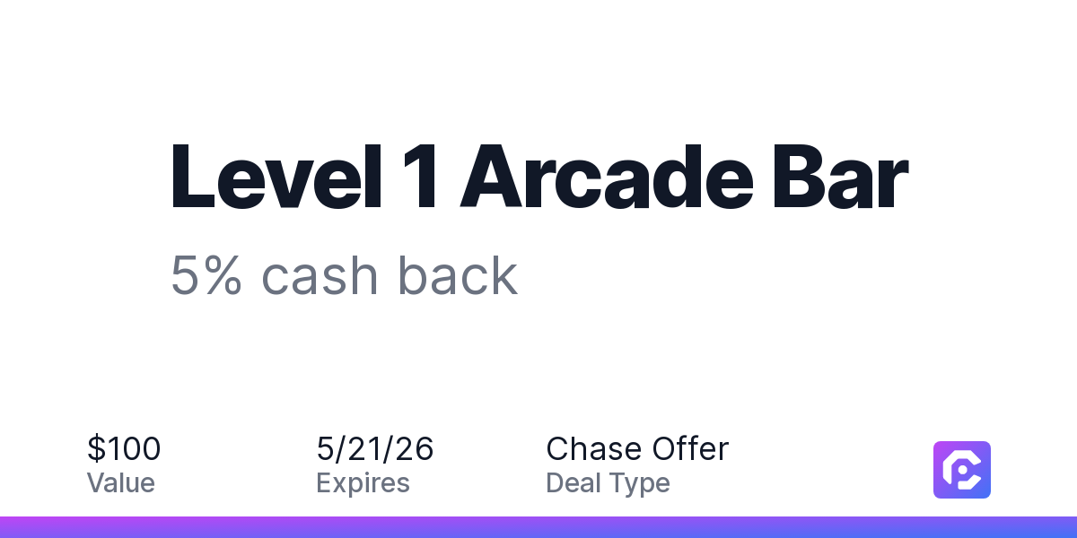 Earn 5% cash back on all of your Level 1 Arcade Bar purchases, until a $100.00 cash back maximum is reached.