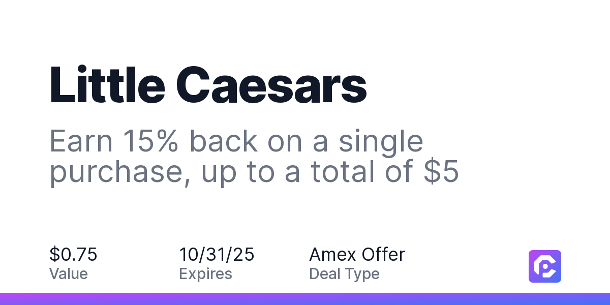 Earn 15% back as a one-time statement credit after using your enrolled eligible Card to make a single purchase in-store at Little Caesars or online at littlecaesars.com by 10/31/2025. Limit of 1 statement credit, up to a total of $5. See terms.