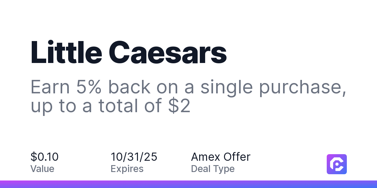 Eligibility and EnrollmentEnrollment is limited. Eligible Card Members must first add offer to Card and then use same Card for qualifying spend. Only US-issued American Express® Cards are eligible.Limit of 1 statement credit per eligible Card Member account. If the Card Account is canceled or past due, it may not qualify to receive the statement credit(s).Qualifying PurchasesOffer valid in-restaurant and for food purchases made online at US website littlecaesars.com and through the merchant mobile app. Dining or takeout/delivery orders must be processed directly by the merchant. Valid at participating locations in the US. Offer valid only on purchases made in US dollars.Offer only valid on purchases made directly with the merchant. Offer not valid on purchases made using third parties, such as resellers, delivery services, or other intermediaries.Statement CreditPlease allow 90-days after 10/31/2025 for the statement credit(s) to be posted to the Account, provided that American Express receives information from the merchant about your qualifying purchase. Participation in Amex Offers is subject to Amex Offers Program Terms.POID: K7Z2:0458