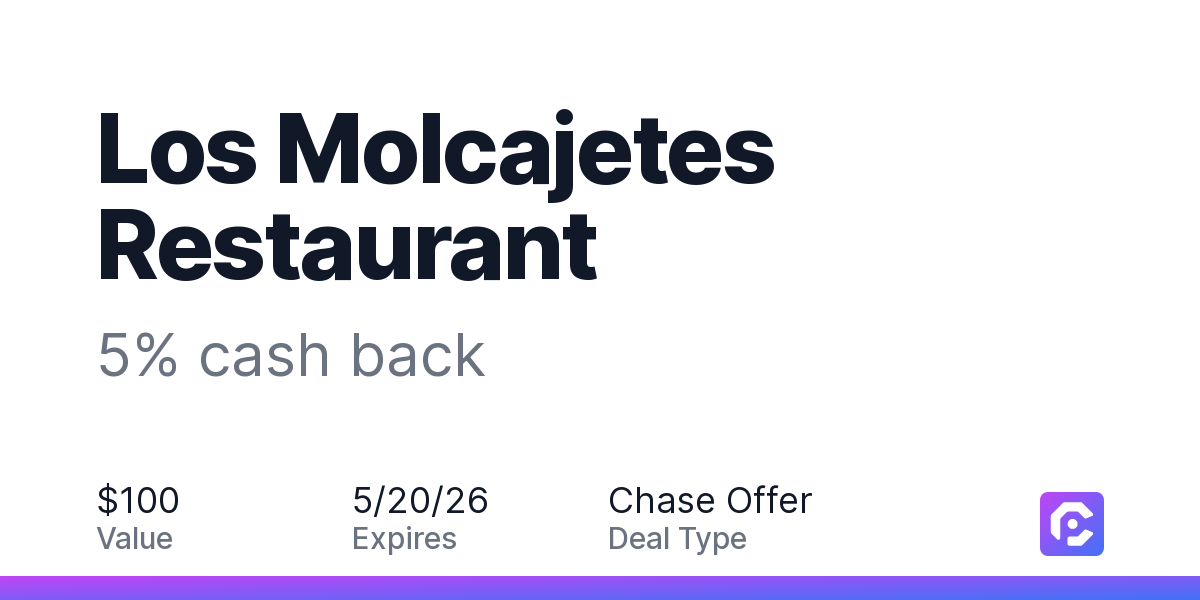 Earn 5% cash back on all of your Los Molcajetes Restaurant purchases, until a $100.00 cash back maximum is reached.