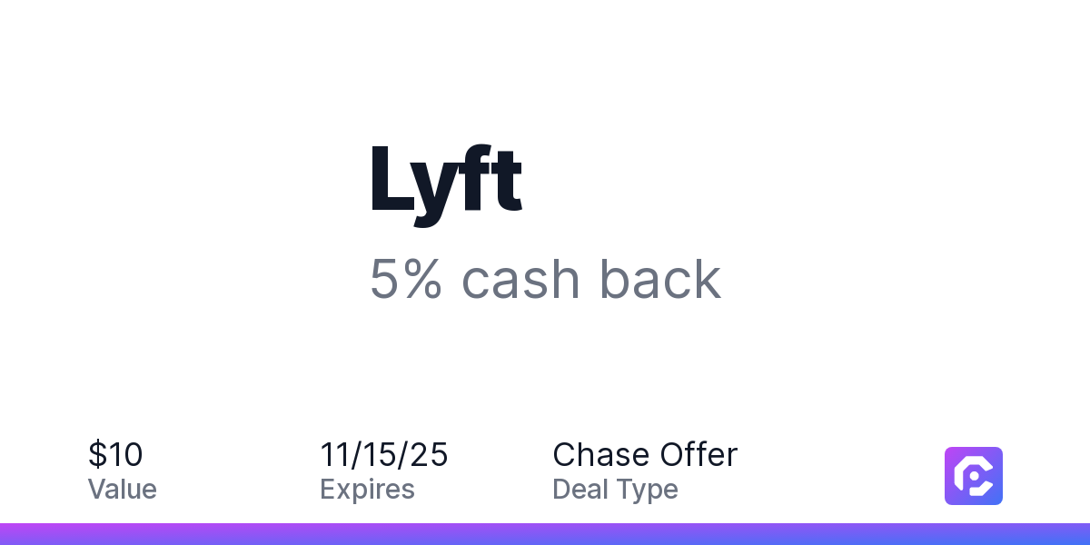 Earn 5% cash back on your Lyft purchase, including taxes and after any discounts, with a $10 cash back maximum.Whether you're catching a flight, heading out for the night, commuting to the office, or running errands, the Lyft app helps you get there - with ride options for every occasion. Choose Priority Pickup to get going fast, select Lyft XL with room for up to 6, or Extra Comfort for a newer, roomier ride.Offer expires 11/15/2025. Offer valid one time only. Offer only valid on purchase made directly with the merchant. Offer valid online only. Offer not valid on purchase made using third-party services, delivery services, or a third-party payment account (e.g., buy now pay later). Offer only valid on U.S. purchase. It is possible that the merchant may split your purchase into multiple transactions. Offer redemption awarded as statement credit on the first qualifying transaction amount. Payment must be made on or before 11/15/2025.