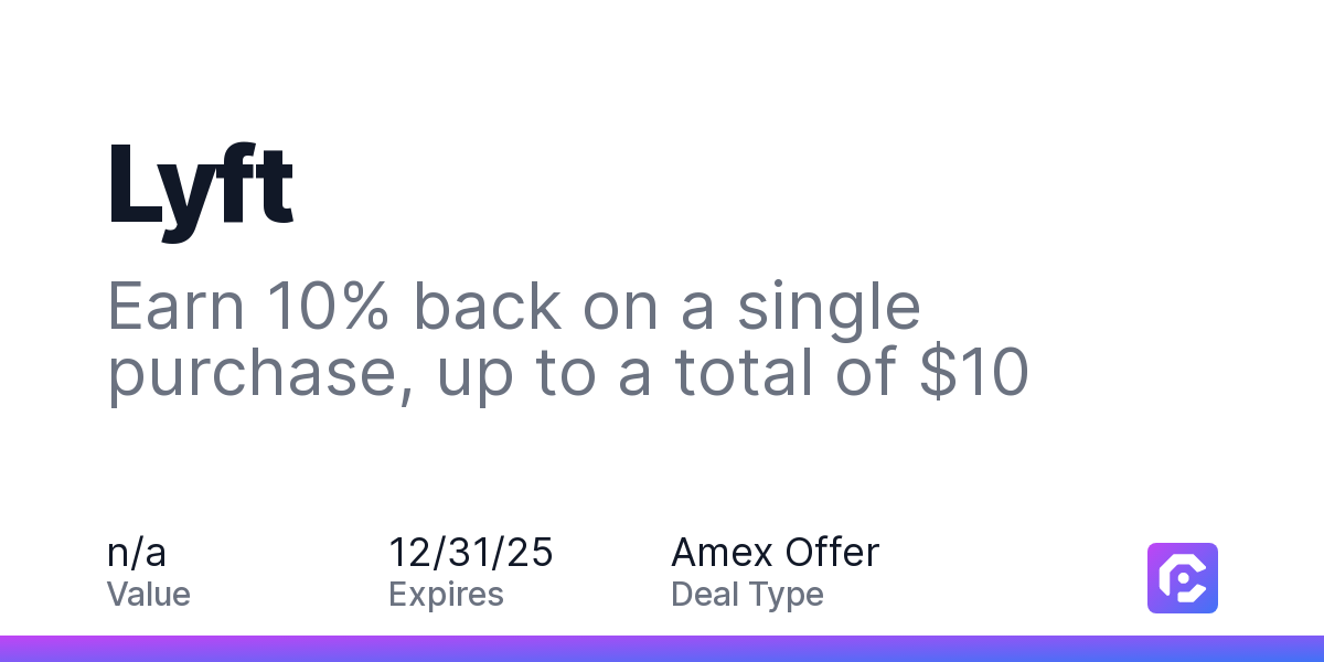 Eligibility and EnrollmentEnrollment is limited. Eligible Card Members must first add offer to Card and then use same Card for qualifying spend. Only US-issued American Express® Cards are eligible.Limit of 1 statement credit per eligible Card Member account. If the Card Account is canceled or past due, it may not qualify to receive the statement credit(s).Qualifying PurchasesMust use enrolled Card as payment method directly with Lyft mobile app. Excludes electronic gift card purchases and international rides. Offer valid only on purchases made in US dollars.Offer only valid on purchases made directly with the merchant. Offer not valid on purchases made using third parties, such as resellers, delivery services, or other intermediaries.Statement CreditPlease allow 90-days after 12/31/2025 for the statement credit(s) to be posted to the Account, provided that American Express receives information from the merchant about your qualifying purchase.Participation in Amex Offers is subject to Amex Offers Program Terms.POID: KAO9:0001