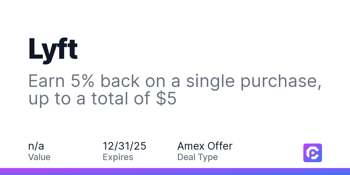 Earn 5% back as a one-time statement credit after using your enrolled eligible Card to make a single purchase through the Lyft mobile app by 12/31/2025. Must use enrolled Card as payment method directly with Lyft mobile app. Limit $5 back in total statement credits. See terms.