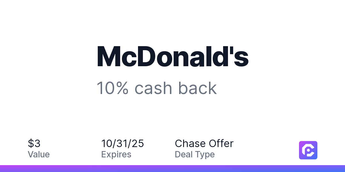 Offer expires 10/31/2025. Offer valid in-restaurant and for food purchases made online at US website mcdonalds.com and through the merchant mobile app. Dining or takeout/delivery orders must be processed directly by the merchant. Valid in the US only. Payment must be made directly with the merchant. Offer not valid on purchases made using third-party services, delivery services, or a third-party payment account (e.g., buy now pay later). Payment must be made on or before offer expiration date. Offer valid one time only.
