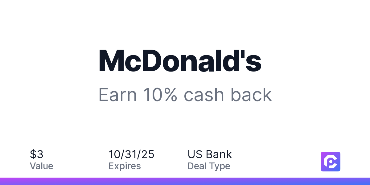 Earn 10% cash back on your McDonald's purchase, with a $3 cash back maximum.