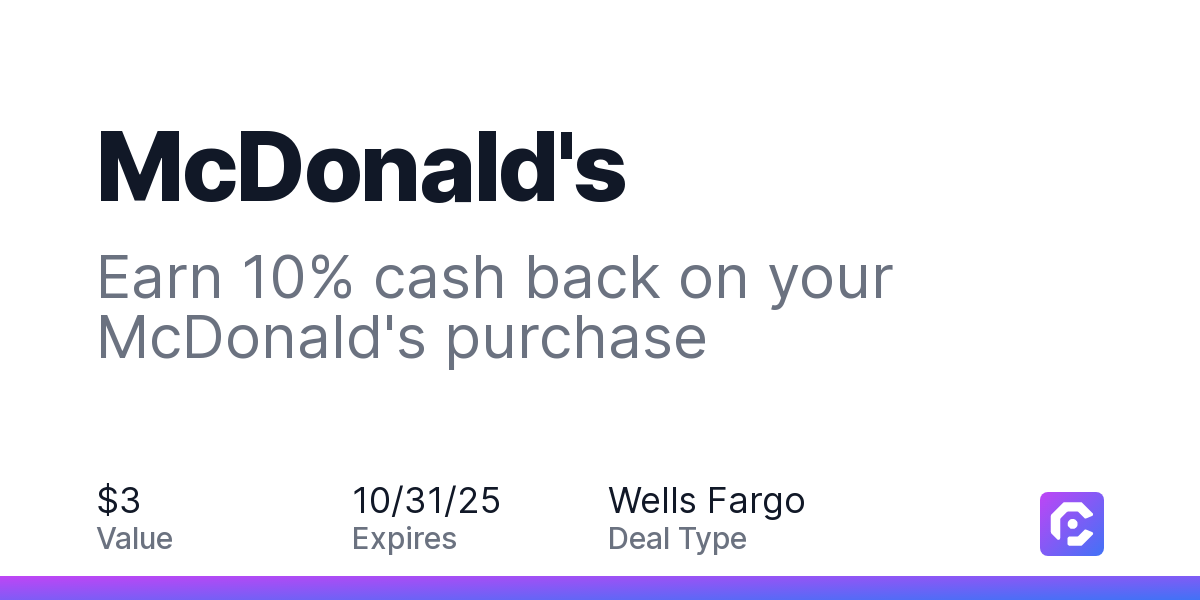 Earn 10% cash back on your McDonald's purchase, with a $3.00 cash back maximum. Craving McDonald's®? Whether your favorite is the Big Mac®, or World Famous Fries®, there's something for everyone at McDonald's®. Visit today, and use the app to earn bonus points on your McDonald's® orders. See local menu prices and order McDonald's® classics through the app today, and earn points towards free food with MyMcDonald's Rewards. Order Now Offer expires 10/31/2025. Offer valid in-restaurant and for food purchases made online at US website mcdonalds.com and through the merchant mobile app. Dining or takeout/delivery orders must be processed directly by the merchant. Valid in the US only. Payment must be made directly with the merchant. Offer not valid on purchases made using third-party services, delivery services, or a third-party payment account (e.g., buy now pay later). Payment must be made on or before offer expiration date. Offer valid one time only.