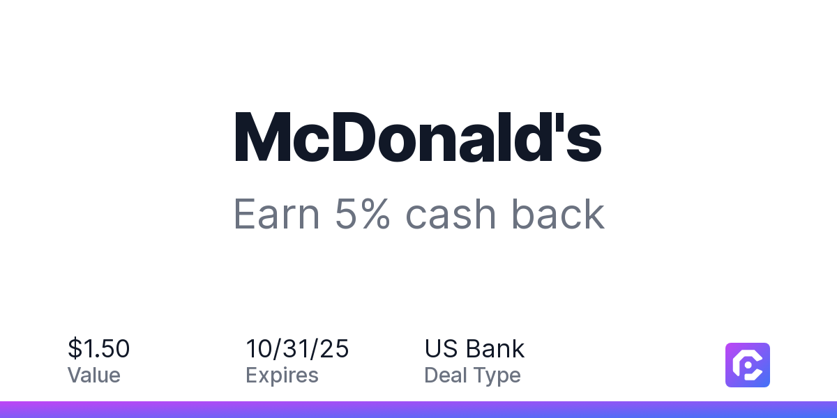 Earn 5% cash back on your McDonald's purchase, with a $1.50 cash back maximum.