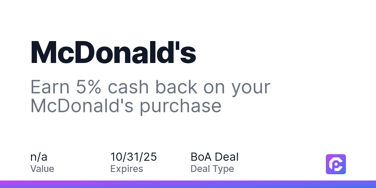 Earn 5% cash back on your McDonald's purchase, with a $1.50 cash back maximum.Craving McDonald’s®? Whether your favorite is the Big Mac®, or World Famous Fries®, there's something for everyone at McDonald's®. Visit today, and use the app to earn bonus points on your McDonald’s® orders. See local menu prices and order McDonald’s® classics through the app today, and earn points towards free food with MyMcDonald's Rewards.Order NowOffer expires 10/31/2025. Offer valid in-restaurant and for food purchases made online at US website mcdonalds.com and through the merchant mobile app. Valid in the US only. Payment must be made directly with the merchant. Offer not valid on purchases made using third-party services, delivery services, or a third-party payment account (e.g., buy now pay later). Payment must be made on or before offer expiration date. Offer valid one time only.Payment must be made directly with the merchant.Purchases made using digital wallets, order-ahead apps or delivery services may not qualify where the identity of the merchant is not passed to us as part of the transaction.Please review all of the above terms for eligible locations, time and date restrictions.