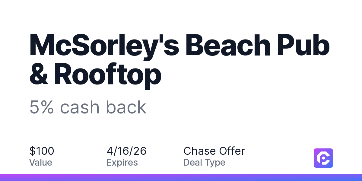 Earn 5% cash back on all of your McSorley's Beach Pub & Rooftop purchases, until a $100.00 cash back maximum is reached.