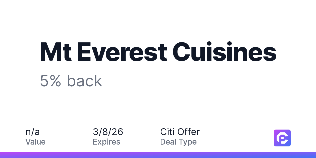 You'll be notified when there are new Mt Everest Cuisines offers available.