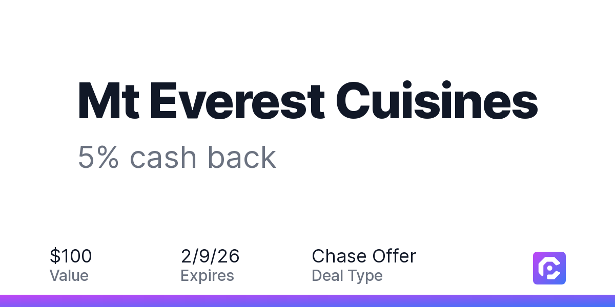 Earn 5% cash back on all of your Mt Everest Cuisines purchases, until a $100.00 cash back maximum is reached.