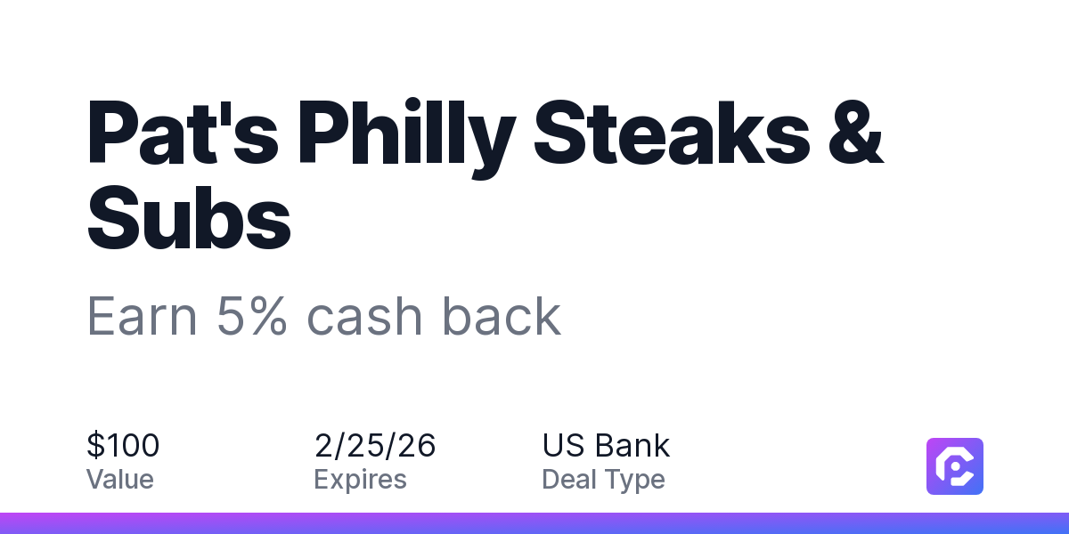 Earn 5% cash back on all of your Pat's Philly Steaks & Subs purchases, until a $100 cash back maximum is reached.
