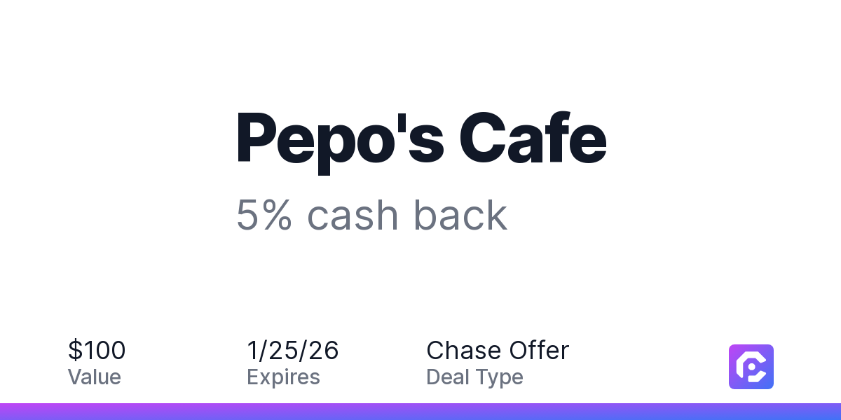 Earn 5% cash back on all of your Pepo's Cafe purchases, until a $100.00 cash back maximum is reached.
