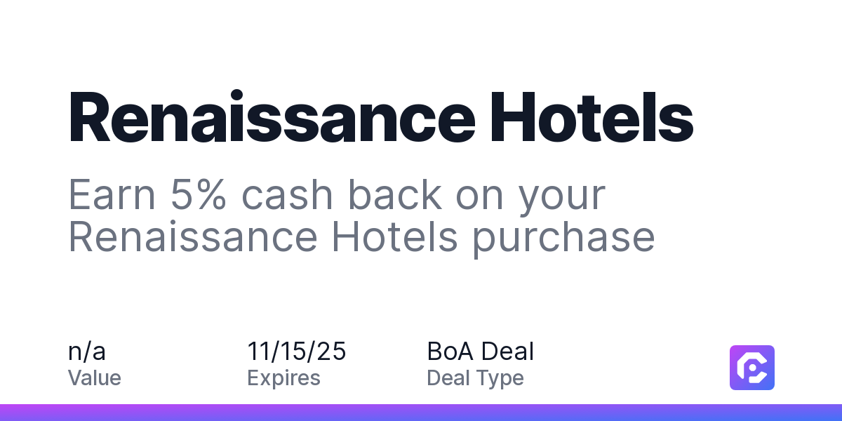 Earn 5% cash back on your Renaissance Hotels stay, with a $39.00 cash back maximum, when you spend $100 or more.Celebrate the spirit of the neighborhood with Renaissance Hotels. Experience unexpected design aesthetics, evening rituals that connect you with the locale and moments of spontaneous discovery that will always leave you with a new sense of the destination. Go there with Marriott Bonvoy.Book NowOffer expires 11/15/2025. Offer valid in-store in the US only and online at US website renaissance-hotels.marriott.com only. Complete payment for your stay must be made by 11/15/2025. Payment must be made directly with the merchant. Offer not valid on purchases made using third-party services. Payment must be made on or before offer expiration date. Offer valid one time only. Offer only valid at Renaissance Hotels properties. Offer not available at other Marriott properties.Payment must be made directly with merchantCash back may not be processed until your travel or stay is completed.If a merchant process your payment in separate transactions, you may only earn cash back on the value of the first transaction.
