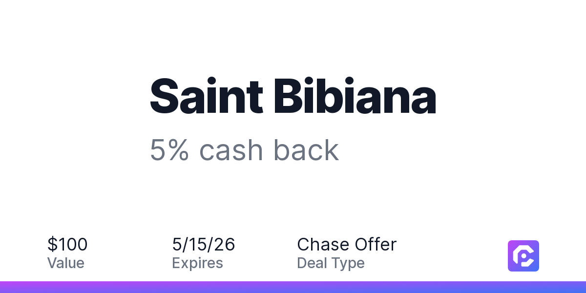 Earn 5% cash back on all of your Saint Bibiana purchases, until a $100.00 cash back maximum is reached.