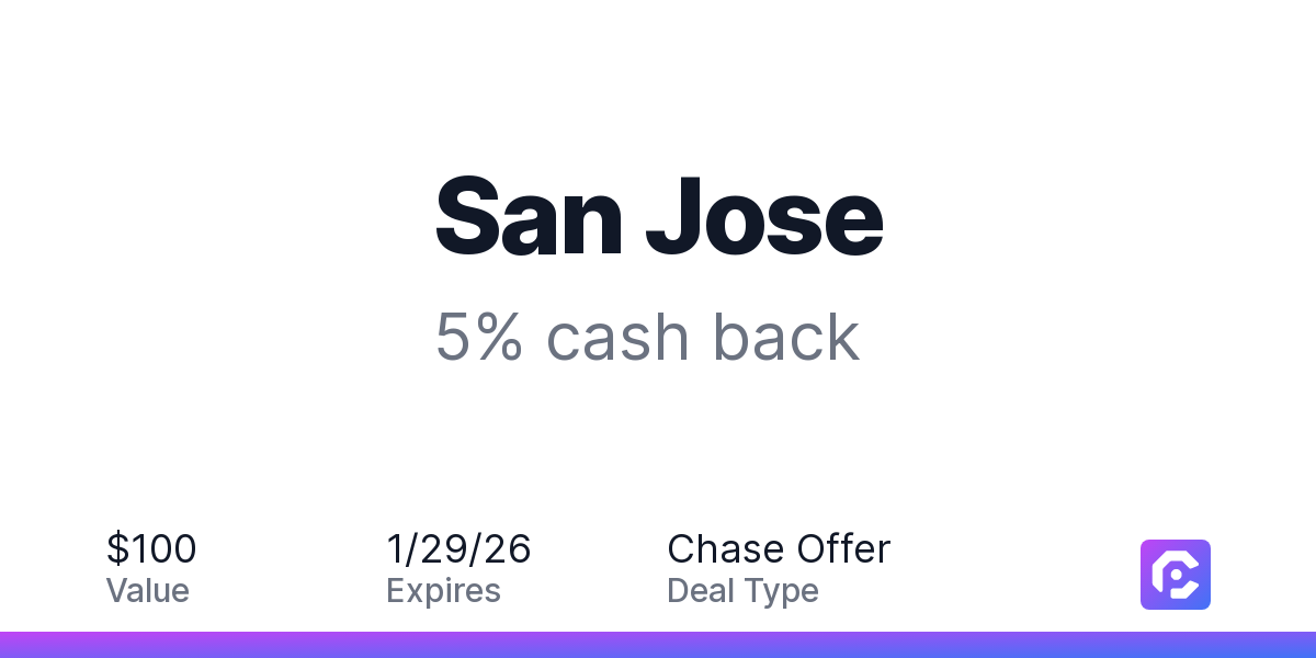 Earn 5% cash back on all of your San Jose purchases, until a $100.00 cash back maximum is reached.