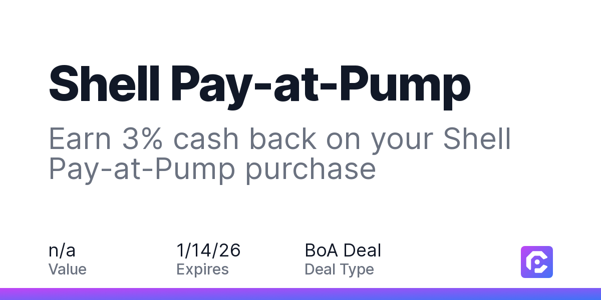 Earn 3% cash back on your Shell Pay-at-Pump purchase, with a $1.50 cash back maximum. Offer only valid on purchases made at the pump.The gasoline you choose matters. All Shell fuels are scientifically proven to help you go further. New Members Save More, Join the Fuel Rewards Program today and save more!Find LocationsOffer expires 1/14/2026. Offer valid on fuel purchases paid for at the pump only. Valid in the US only. Payment must be made directly with the merchant. Offer not valid on purchases made using third-party services, delivery services, or a third-party payment account (e.g., buy now pay later). Offer not valid on in-store, convenience, tobacco, alcohol, or lottery purchases. Payment must be made on or before offer expiration date. Offer valid one time only. Compared to minimum detergent gasoline containing similar ethanol content. Actual effects and benefits may vary according to vehicle type, driving conditions and driving style.Payment must be made directly with the merchant.Purchases made using digital wallets, order-ahead apps or delivery services may not qualify where the identity of the merchant is not passed to us as part of the transaction.Please review all of the above terms for eligible locations, time and date restrictions.