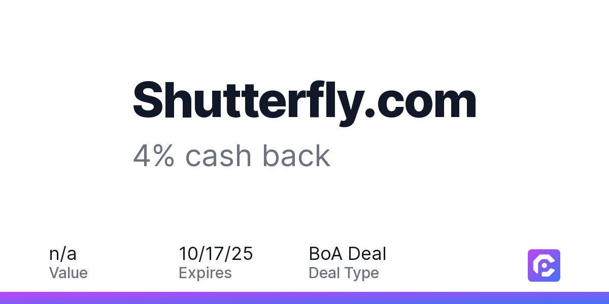 Double Days are valid from 10/6 to 10/17.To qualify, you must access the "Double Days" marked BankAmeriDeals® between 10/6 and 10/17 using the link below to initiate your shopping strip at the Shutterfly.com website. Click through and add eligible item(s) to your cart and check out as you normally would. Cash back awards are calculated only on eligible items purchased and exclude any returns, taxes and shipping on the total order. Please note returning part or all of your order will affect your cash back reward. In most cases, your Double Days cash back will be a single cash back transaction from the merchant on the Earned tab within 30 days of transaction posting date.Remember to make your Double Days purchase in the same session with no limit to your cash back, and you can do this multiple times!SHOP DOUBLE DAYSMerchant specific terms and conditions may apply. See merchant interstitial and transition page for details and exclusions.Payment must be made directly with merchantCash back may not be processed for over 30 days or until a complete future billing cycle.Bank of America is only responsible for posting the statement credit to your account based on the data it receives from its third-party service provider.