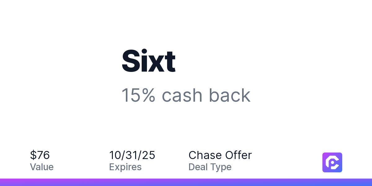 Earn 15% cash back on your Sixt purchase when you spend $500 or more, including taxes and after any discounts, with a $76 cash back maximum.Rent THE car with SIXT. With more new cars and the premium brands you love, SIXT has your rental car needs covered. You can find us in major airports and convenient downtown branches across the globe. Book now to earn cash back.Offer expires 10/31/2025. Offer valid one time only. Offer only valid on purchase made directly with the merchant either online or at a SIXT location within the U.S. Offer not valid on purchases made using third-party services or a third-party payment account (e.g., buy now pay later). Offer not valid at third-party retailers. It is possible that the merchant may split your purchase into multiple transactions. Offer redemption awarded as statement credit on the first qualifying transaction amount. Offer valid only for rentals in the U.S. In order to redeem, payment must be made in advance or the rental must be returned on or before 10/31/2025.