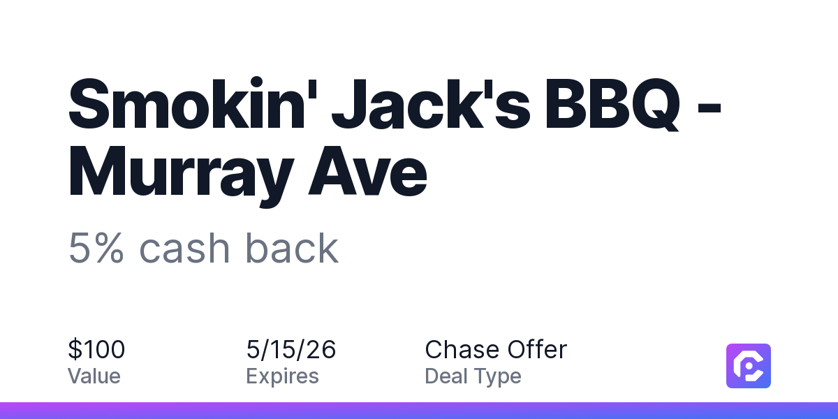 Earn 5% cash back on all of your Smokin' Jack's BBQ - Murray Ave purchases, until a $100.00 cash back maximum is reached.