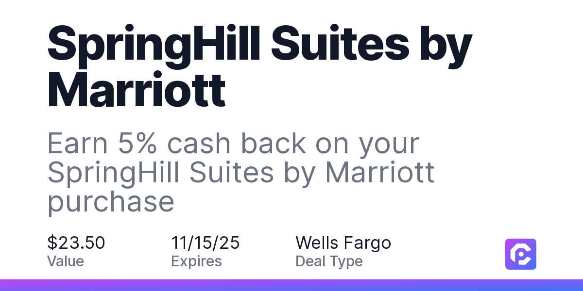 Earn 5% cash back on your SpringHill Suites by Marriott stay, with a $23.50 cash back maximum, when you spend $100 or more. Discover a little extra and a lot less ordinary with SpringHill Suites by Marriott. Featuring suites designed with a little extra room so you can indulge, relax or work, plus smart design, and complimentary hot breakfast daily to help you savor your time away. Go there with Marriott Bonvoy. Book Now Offer expires 11/15/2025. Offer valid in-store in the US only and online at US website springhillsuites.marriott.com only. Complete payment for your stay must be made by 11/15/2025. Payment must be made directly with the merchant. Offer not valid on purchases made using third-party services. Payment must be made on or before offer expiration date. Offer valid one time only. Offer only valid at SpringHill Suites by Marriott properties. Offer not valid at other Marriott properties.