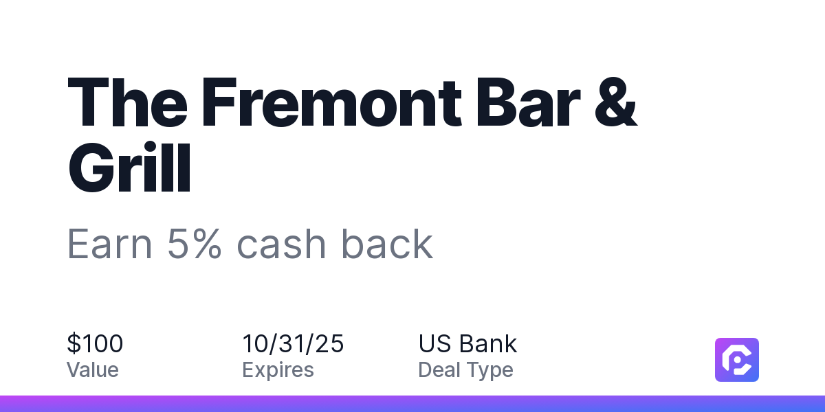 Earn 5% cash back on all of your The Fremont Bar & Grill purchases, until a $100 cash back maximum is reached.