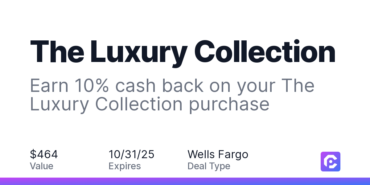 Earn 10% back on your The Luxury Collection stay, with a $464.00 cash back maximum, when you spend $750 or more. For those who yearn to not just discover a new destination but to embrace it, The Luxury Collection awaits. From local traditions to captivating adventures, our hotels offer a gateway to the world's most exciting and desirable destinations — each inspiring a thousand stories tied to the transformative experiences that make each locale unforgettable. Embrace the journey with The Luxury Collection. Book Now Offer expires 10/31/2025. Offer valid in-store in the US and online at US website luxury-collection.marriott.com. Complete payment for your stay must be made by 10/31/2025. Payment must be made directly with the merchant. Offer not valid on purchase made using third-party service or payment account (e.g. buy now pay later). Payment must be made on or before expiration date. Valid one time only. Offer only valid at The Luxury Collection properties.