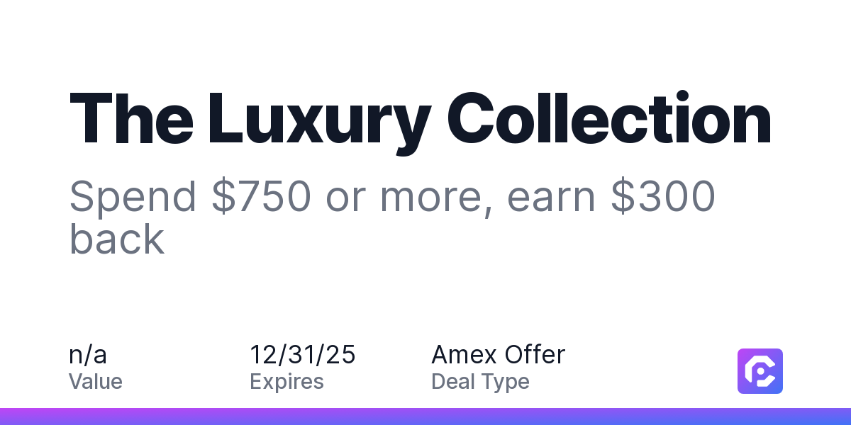 Eligibility and Enrollment Enrollment is limited. Eligible Card Members must first add offer to Card and then use same Card for qualifying spend. Only US-issued American Express® Cards are eligible. Limit of 1 statement credit per eligible Card Member account. If the Card Account is canceled or past due, it may not qualify to receive the statement credit(s). Qualifying Purchases Offer valid only on room rate and room charges at participating The Luxury Collection® properties in the US, Canada, Mexico, and the Caribbean. Not valid at The Ocean Club, a Luxury Collection Resort in Costa Norte. Reservations must be made online at the-luxury-collection.marriott.com, via the Marriott Bonvoy® App or by calling 1-888-236-2427. Excludes all other Marriott brands, timeshares, flight and hotel packages, car rentals, Vacations by Marriott, Marriott Vacation Club, residences, gift cards, online retail purchases, hotel amenities, and purchases of Marriott Bonvoy® points. Qualifying purchases must total a minimum of $750 USD, following conversion from a foreign currency. Offer not valid for lodging stays that are paid for before the promotion start date or after the promotion end date. Offer only valid on purchases made directly with the merchant. Offer not valid on purchases made using third parties, such as resellers, delivery services, or other intermediaries. Statement Credit Please allow 90-days after 12/31/2025 for the statement credit(s) to be posted to the Account, provided that American Express receives information from the merchant about your qualifying purchase. Participation in Amex Offers is subject to Amex Offers Program Terms. POID: KAYI:0001